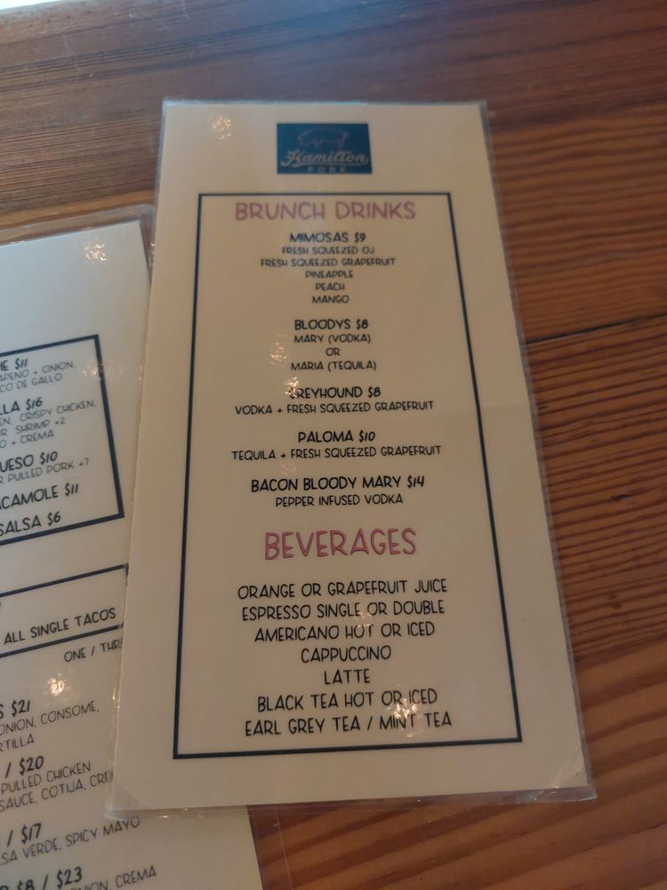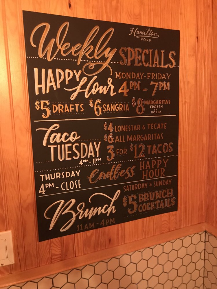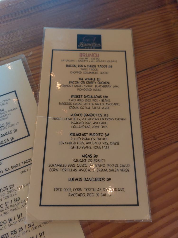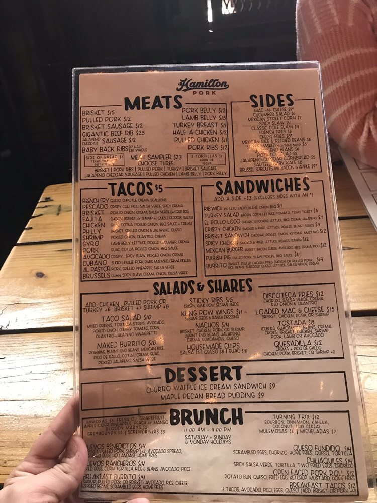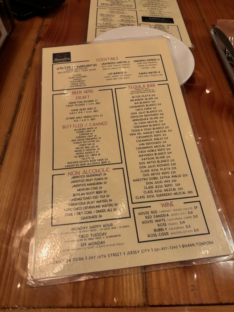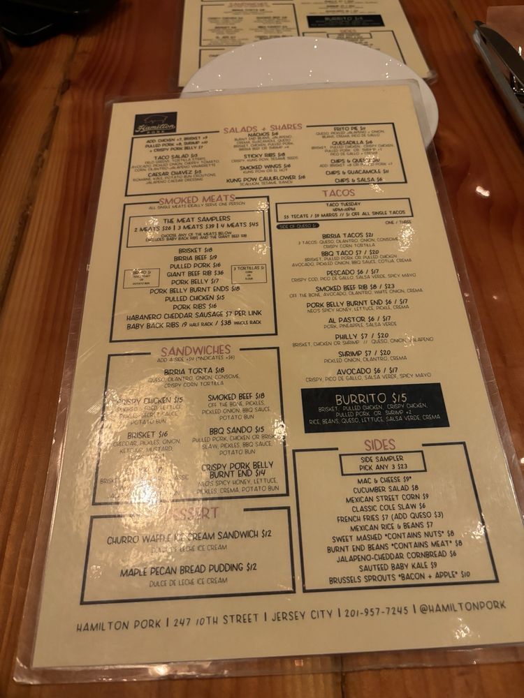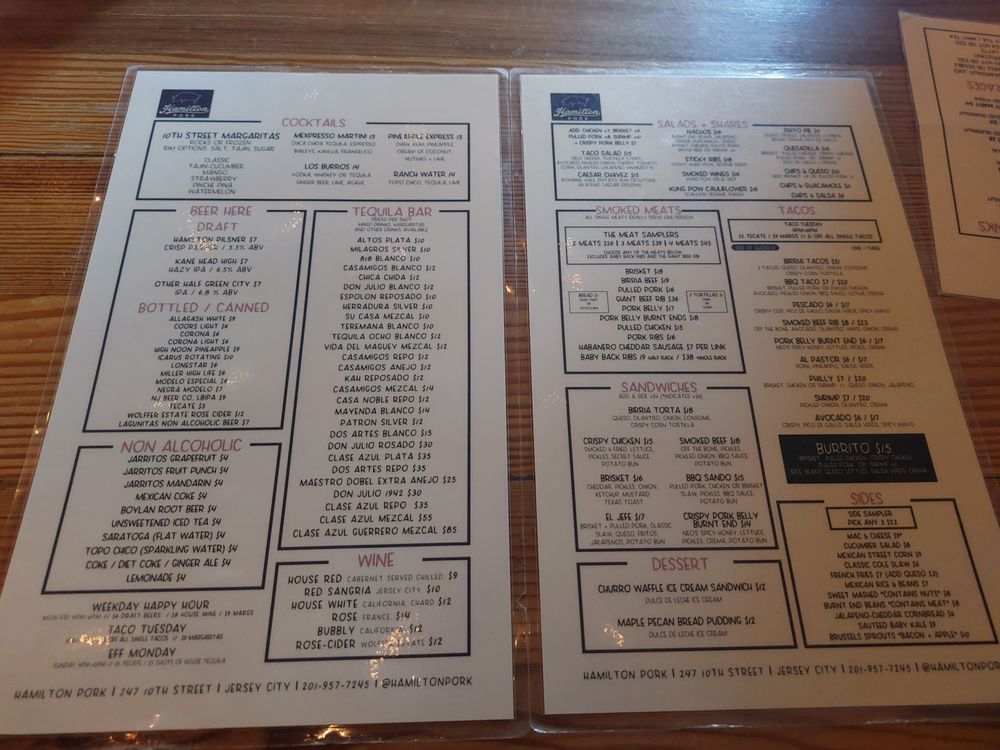 Introducing the menu at Hamilton Pork, a trendy, casual barbecue spot in Jersey City. Offering a variety of meats like brisket, ribs, and tacos, this restaurant is perfect for meat lovers. With options for both meat samplers and single tacos, there is something for everyone. Don't miss out on their flavorful salads and tasty sides like nachos and wings. The menu also includes unique dishes like the Pork Belly Burnt End Taco and the Sticky Ribs. The atmosphere is vibrant and welcoming, making it a great spot for groups or families. With amenities like outdoor seating, free Wi-Fi, and a full bar, Hamilton Pork is sure to satisfy your cravings for delicious barbecue. So gather your friends and head over to enjoy a memorable dining experience at Hamilton Pork.